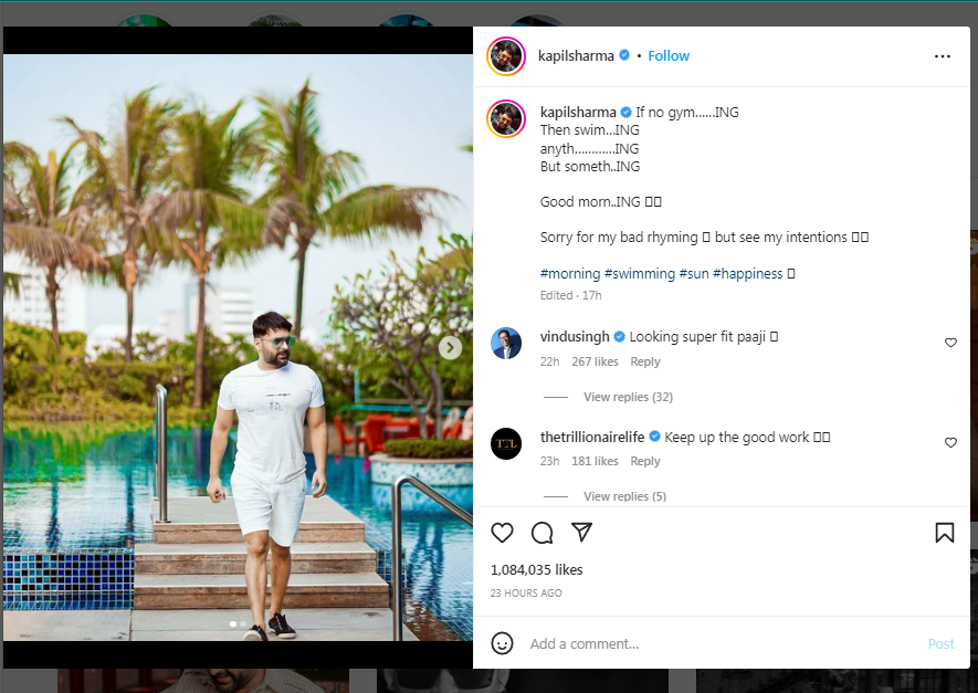 One of Kapil’s fans commented on the photos, saying, “Bhaiji (brother) you are killing it (clapping emojis).” “Super sir, aapne toh body bhi bana li, pata bhi nhi chala kab bana li, pata bhi nhi chala kab bana li, pata bhi nhi chala kab bana li, pata bhi nhi chala kab bana l “Looking super fit,” another fan commented. “Bhai ke biceps (Brother’s biceps) with fire emoji,” one fan added.