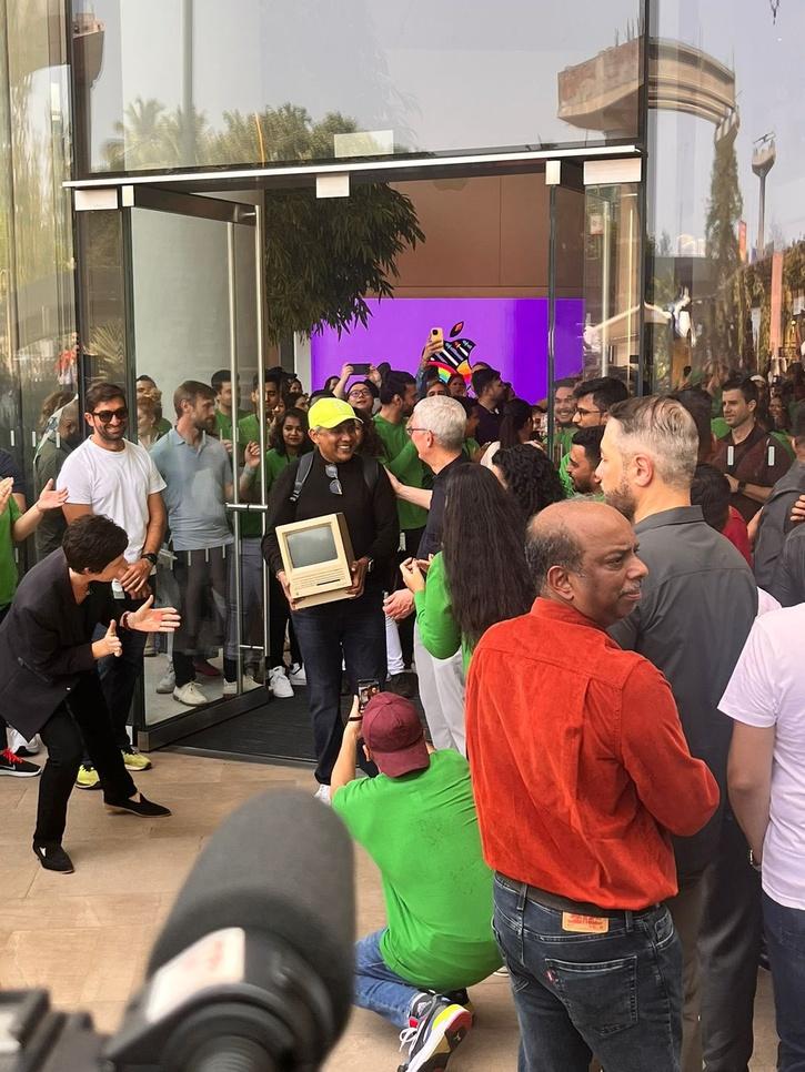 Customers queued outside the glass gates of the new Apple store in Bandra Kurla Complex on Tuesday morning. Tim Cook officially opened the doors to the store, allowing a long line of eager customers inside. The launch commemorates Apple’s 25th anniversary in India, giving the company yet another reason to celebrate at the event.