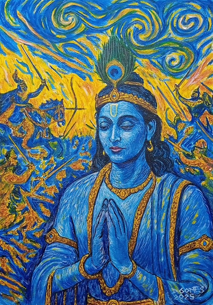 Despite managing a demanding full-time job in marketing and handling personal responsibilities alone, Dr. Gomes never let his creative flame dim. Nights were reserved for painting, fatigue battled with faith, and every canvas was a testament to perseverance. His commitment to showcasing Indian mythology through a contemporary lens shines in his latest masterpiece — a Van Gogh-style depiction of Lord Krishna with folded hands amidst the chaos of war. The piece merges post-impressionist Western influences with Indian mythological themes, a symbolic dialogue between two worlds.