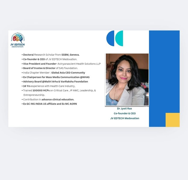 In the rapidly changing world of healthcare, where innovation meets empathy, JV EdTech Medovation stands as a transformative force merging technology, education, and compassion. Founded and led by Dr. Jyoti Dongare Rao, an Emergency Specialist and Doctoral Research Scholar at SSBM Geneva, JV EdTech Medovation is redefining how healthcare professionals learn, grow, and lead in the digital age.