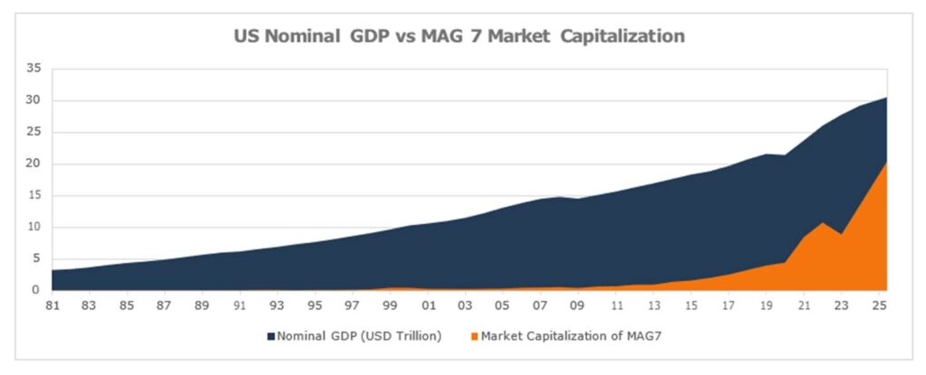 In the US, AI companies have driven unprecedented market cap growth. Nvidia alone hit $5 trillion in market cap and now represents 8% of the entire S&P 500. The “Magnificent Seven” tech giants have seen massive valuations driven by AI infrastructure and applications. Across the US, China, Japan, and South Korea, AI companies have contributed 14–58% of total market cap growth over the past three year.