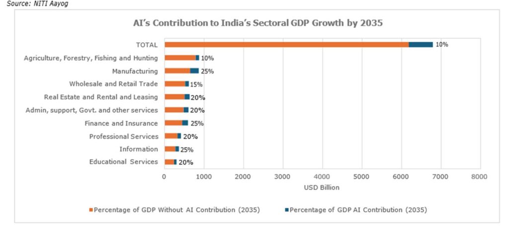 India’s AI revolution is reshaping its economic hierarchy much like the IT export boom of the early 2000s but on a far larger scale. As per EY–Microsoft (2024) and Accenture (2023), AI could contribute up to 10–15 % of GDP by 2035, unlocking nearly US $900 billion in value. The traditional IT services sector in India is a significant contributor to the country’s economy, accounting for about 7.5% of India’s GDP as of the financial year 2023. This sector is poised for strong growth, with its revenue projected to double to approximately Rs. 43.1 lakh crore (about US$ 500 billion) by 2030. The IT ecosystem is expanding rapidly, driven by demands from various verticals like BFSI, telecom, and retail, and the emergence of new technologies such as AI and engineering R&D.